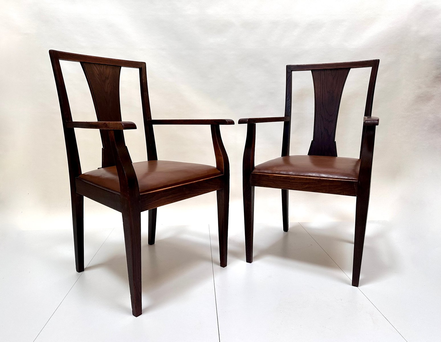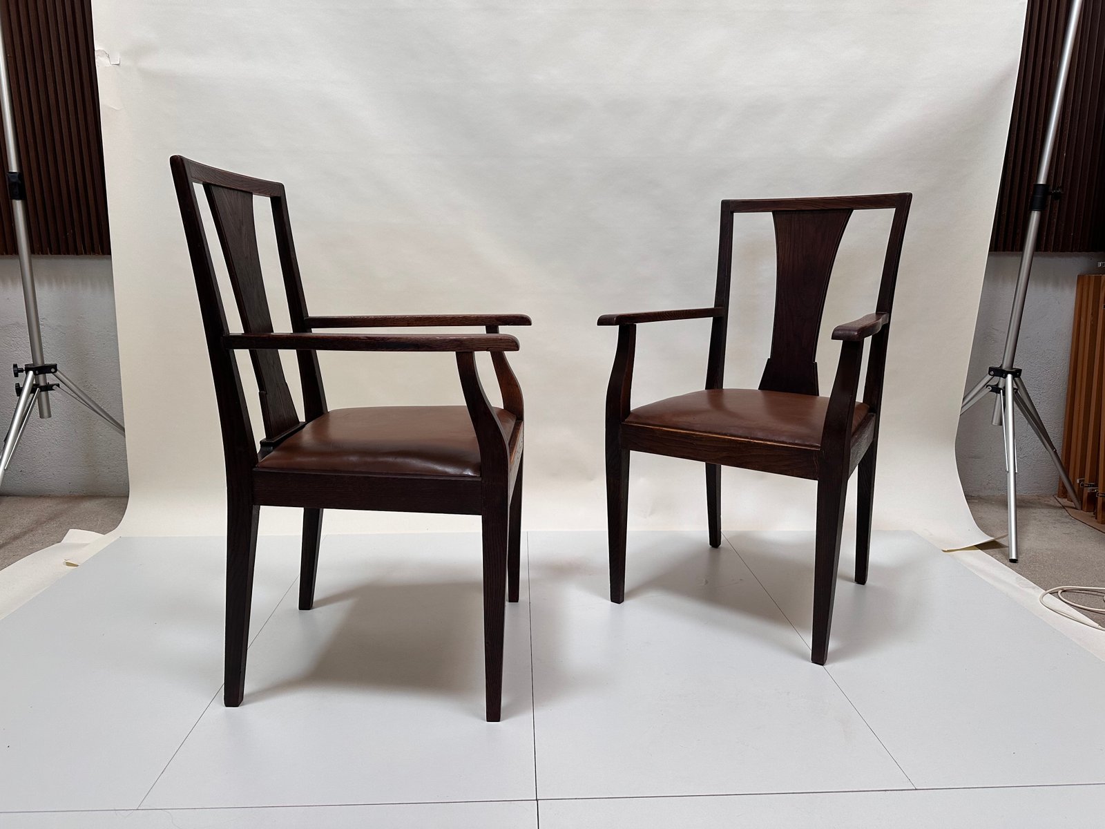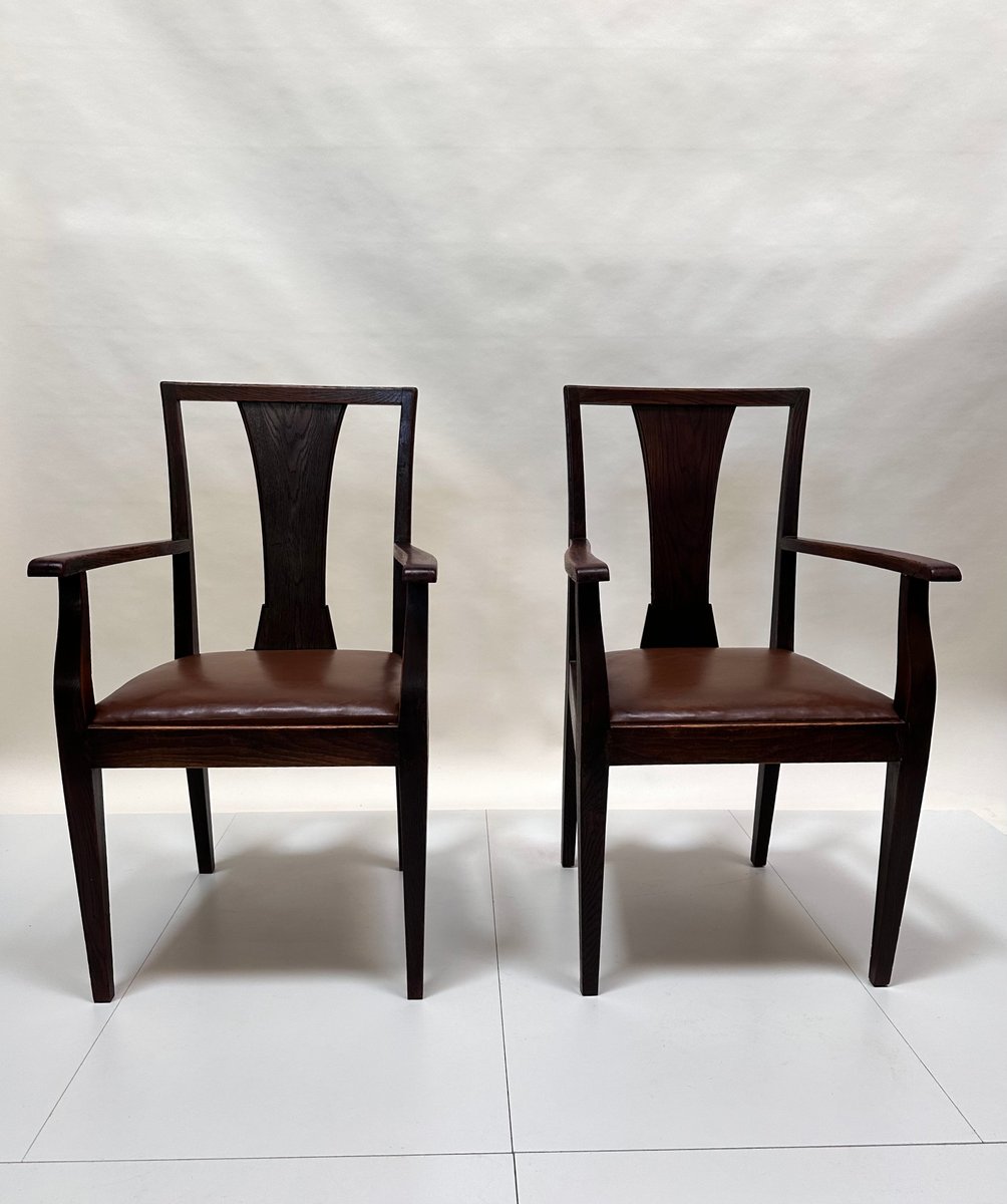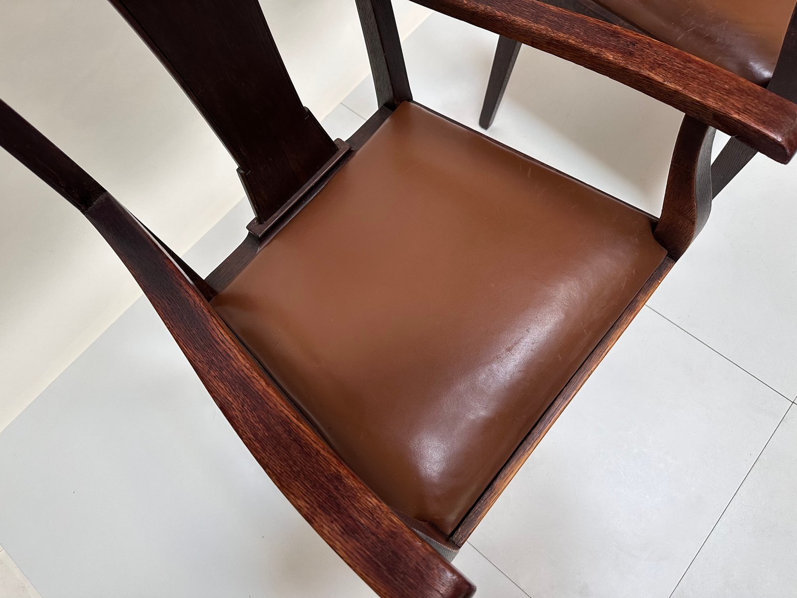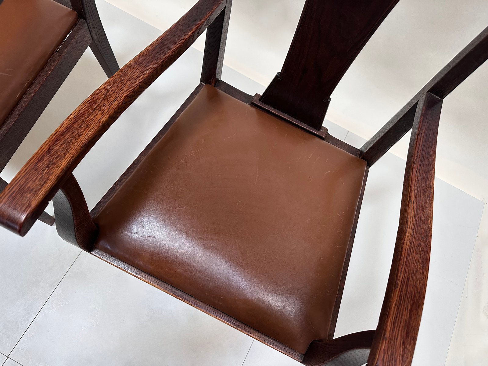 Large Antique Art Deco Stained Oak Armchairs with Leather Seats, Germany, 1920s, Set of 2