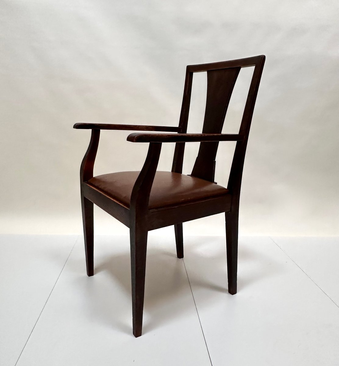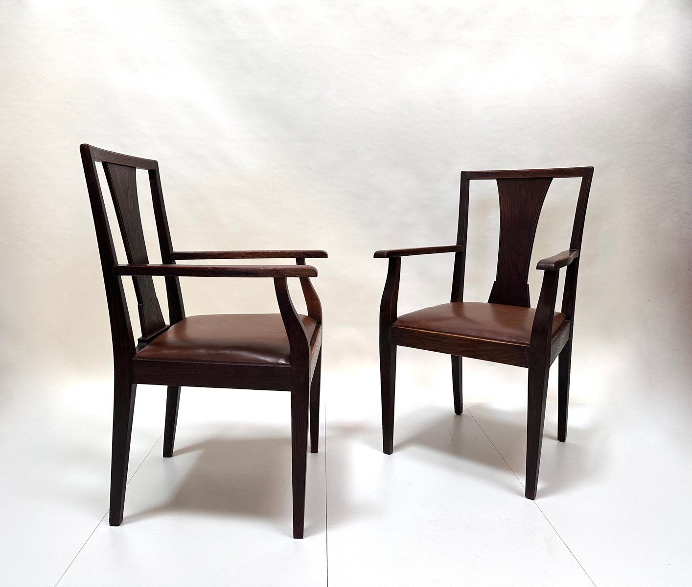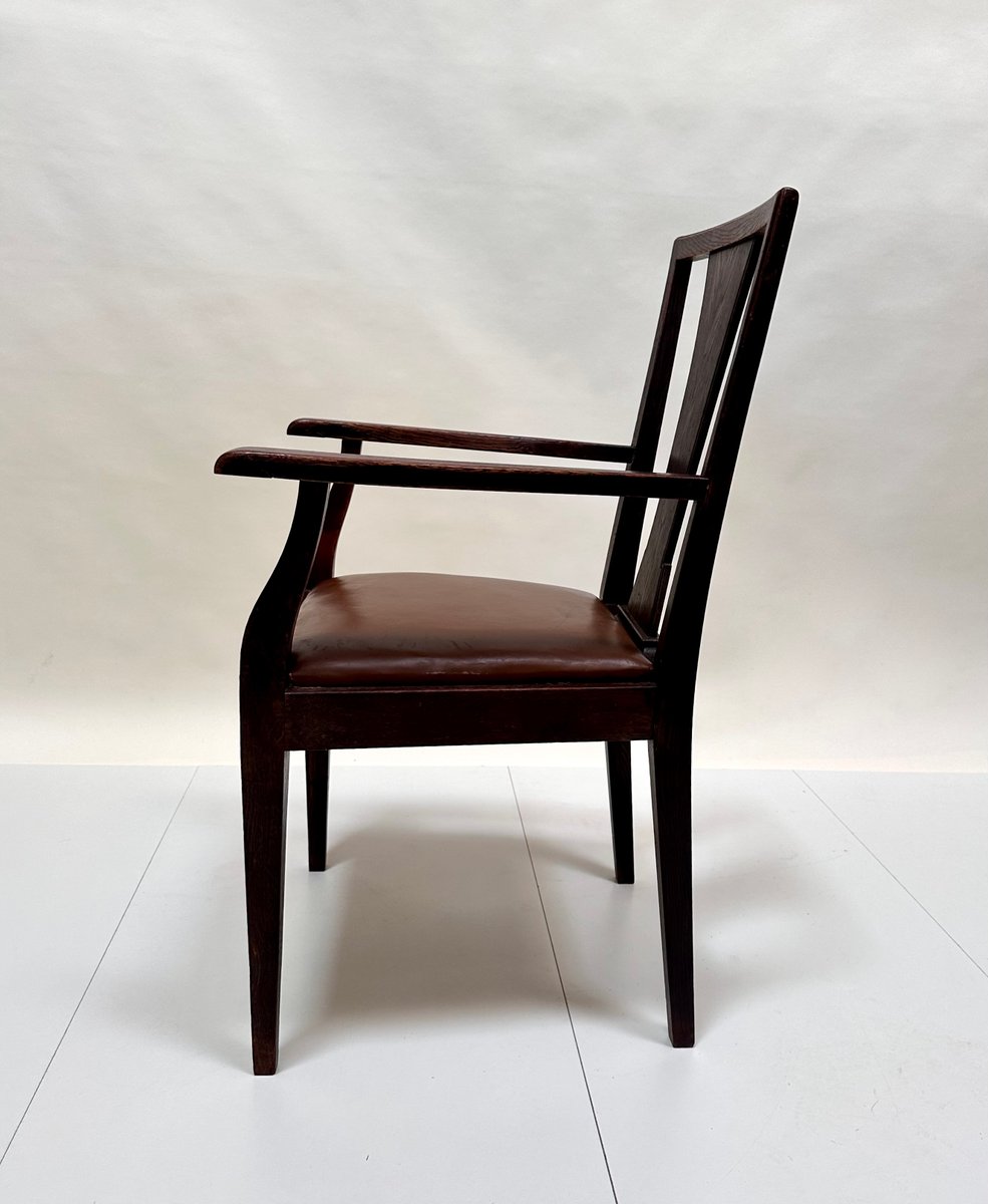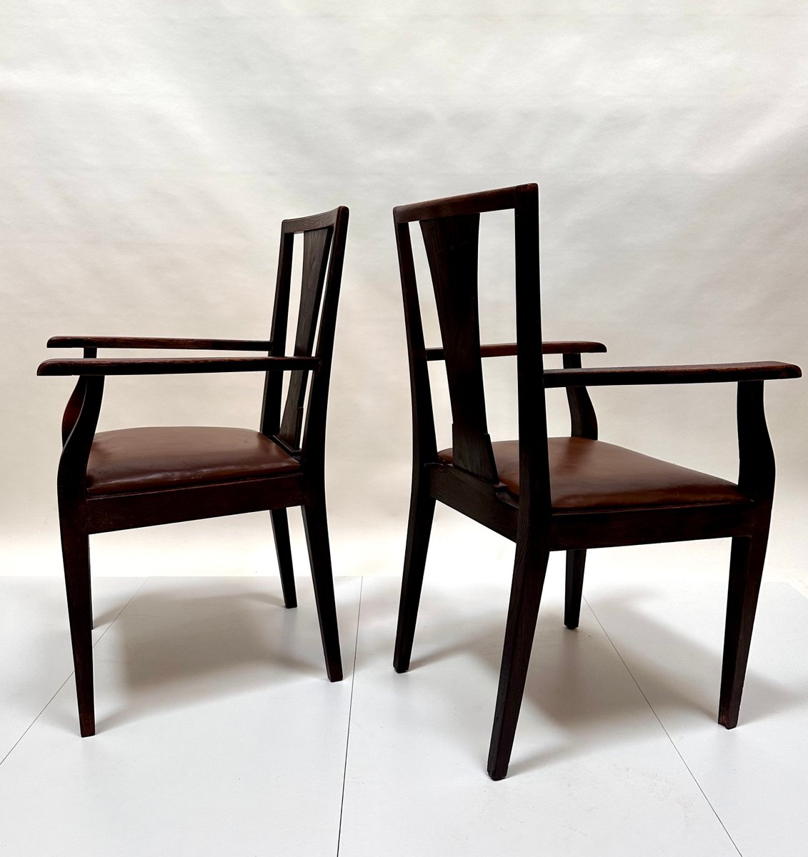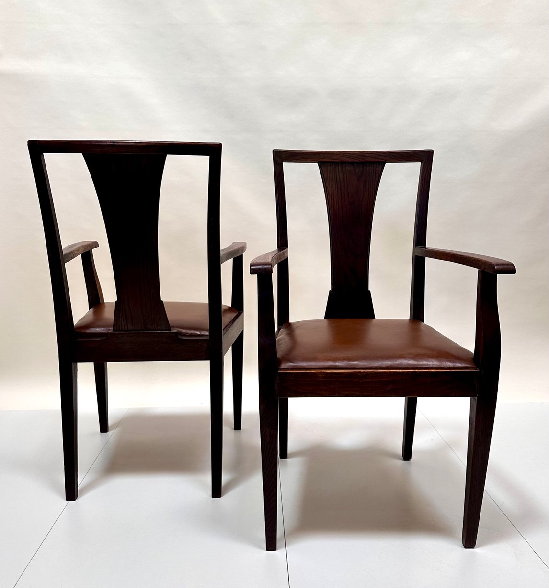Large Antique Art Deco Stained Oak Armchairs with Leather Seats, Germany, 1920s, Set of 2