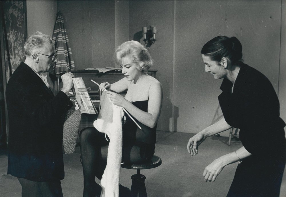 Marilyn Monroe Knitting on Set of Let's Make Love, USA, Black and White Photograph, 1960s