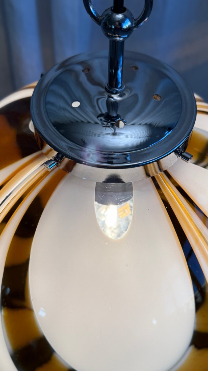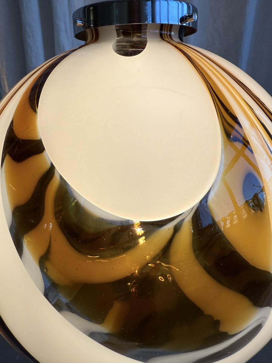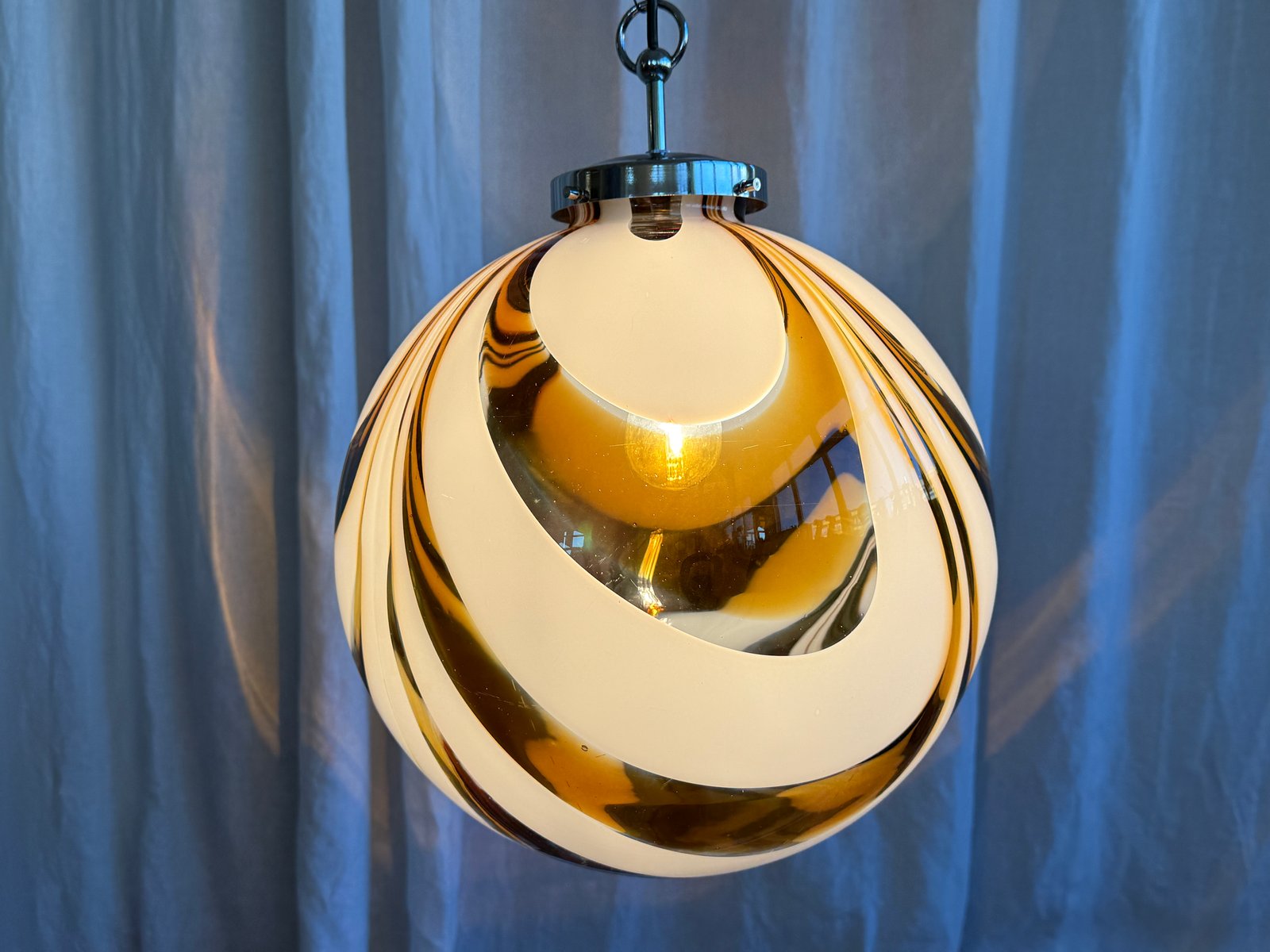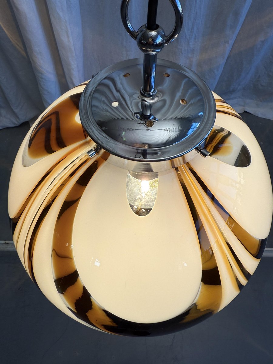 Mid-Century Italian Amber and White Swirl Murano Glass Pendant with Chrome Suspension attributed to Mazzega, 1970s