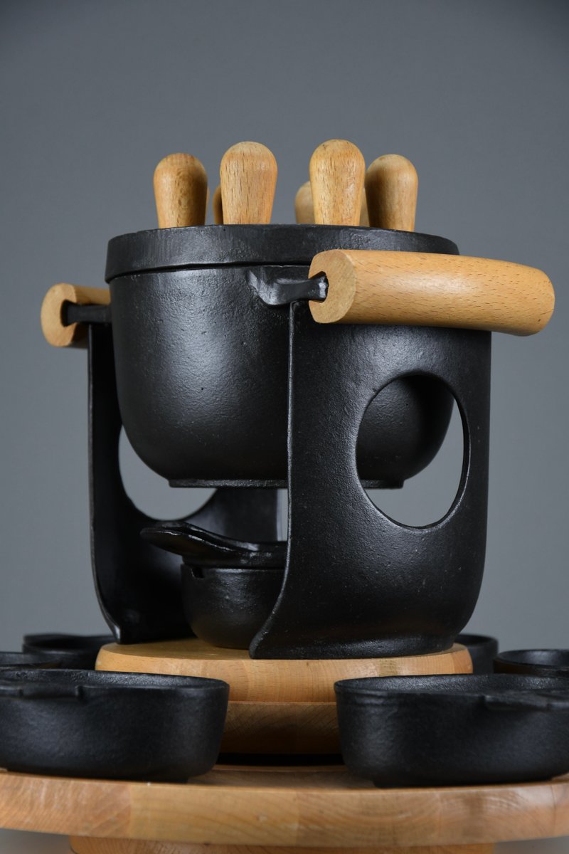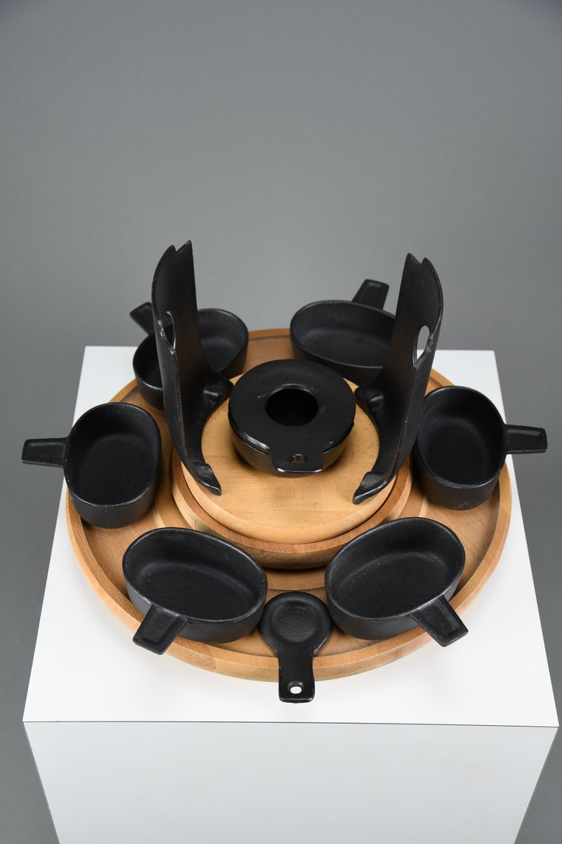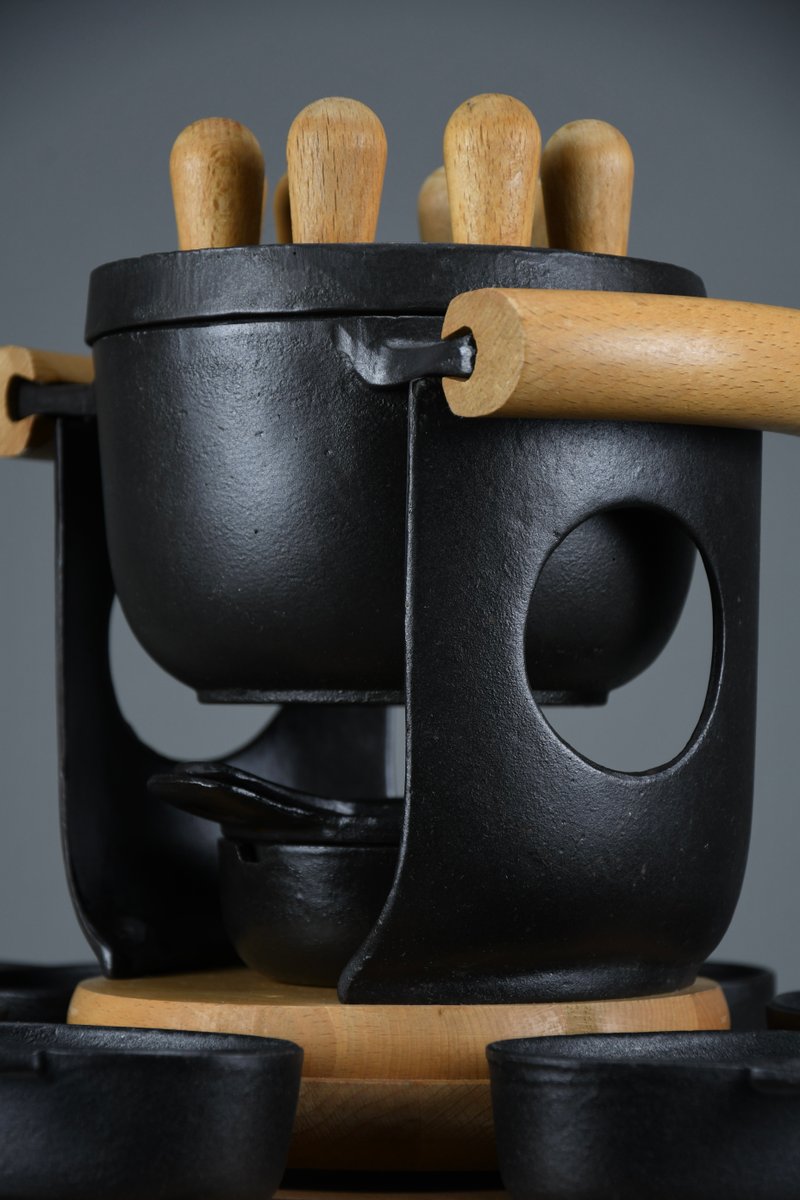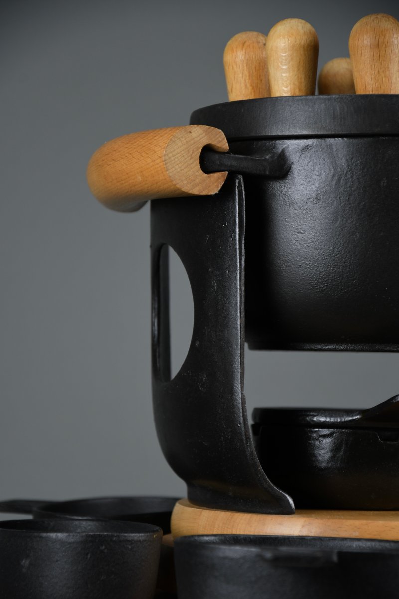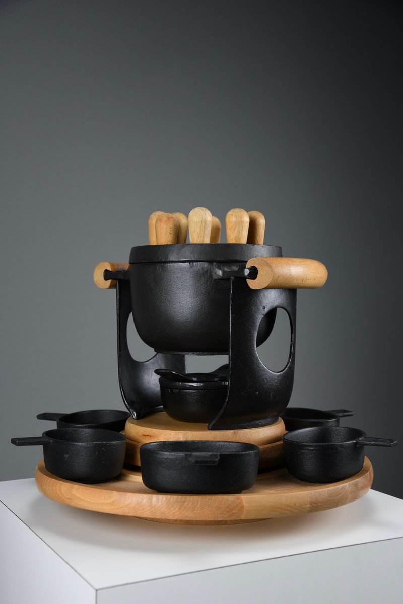 Mid-Century Modern Cast Iron and Wood Fondue Set by Richard Nissen for Bodum, 1960s, Set of 18