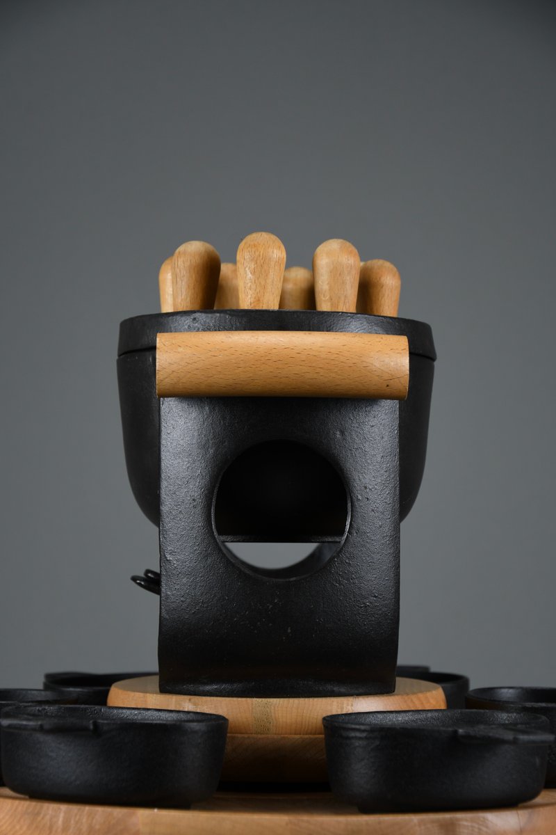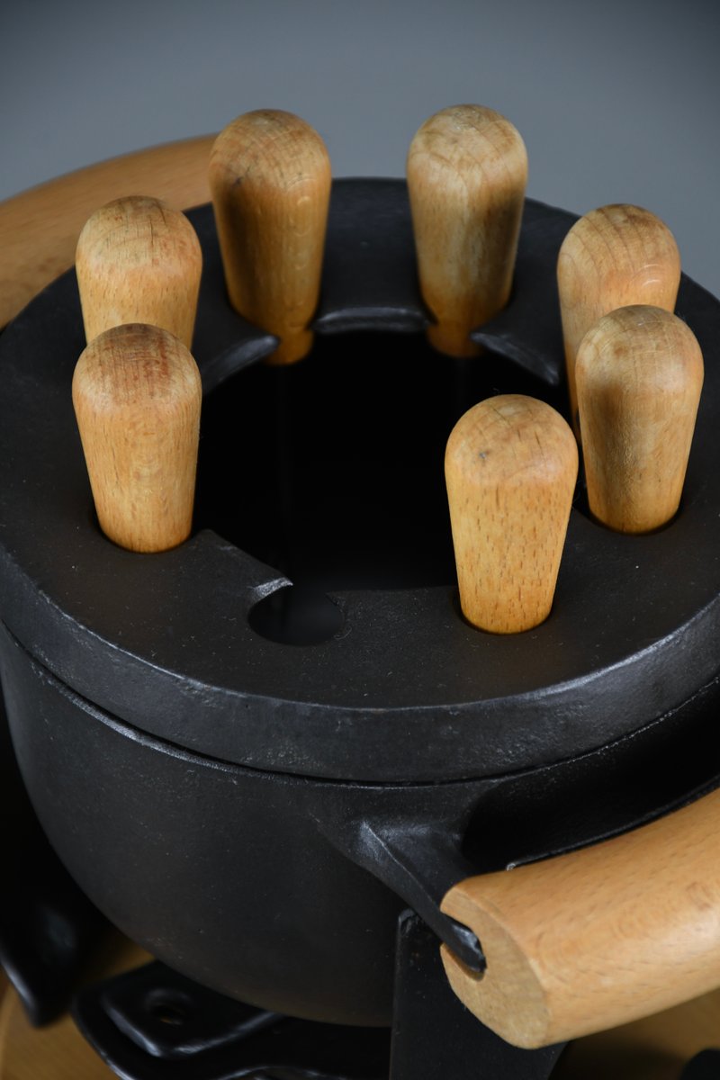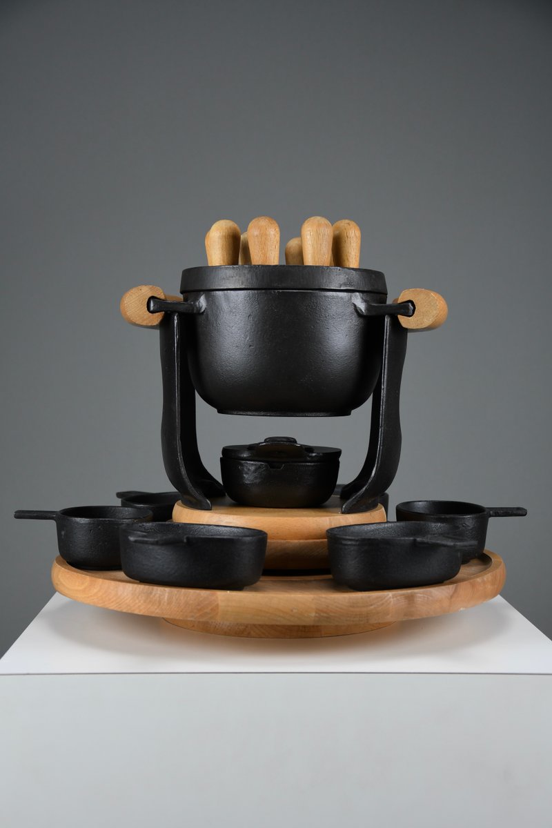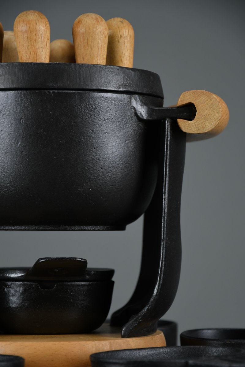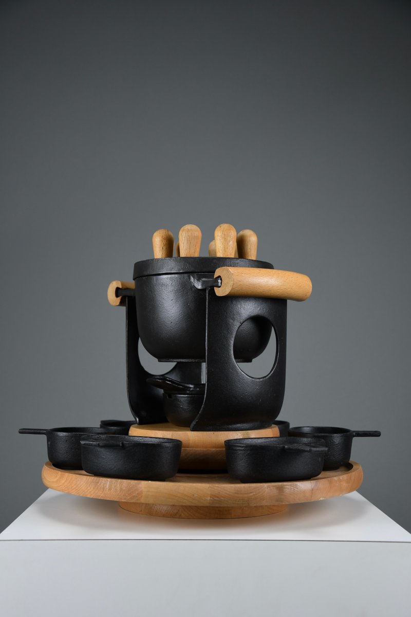 Mid-Century Modern Cast Iron and Wood Fondue Set by Richard Nissen for Bodum, 1960s, Set of 18