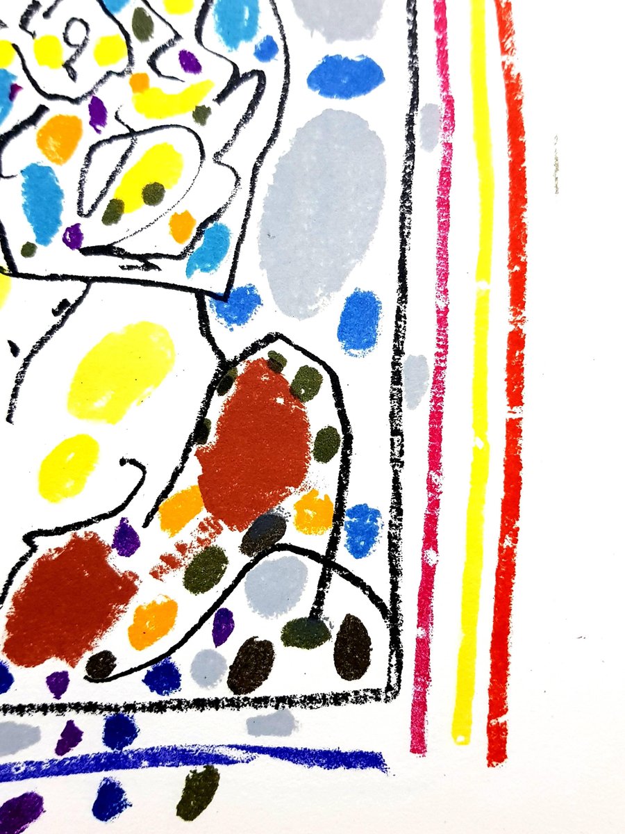 Original Lithograph by Picasso Atelier Mourlot. Paper: Vélin. Dimensions : 9 5/8 x 12 7/16 inches References: Bloch 1017; Mourlot 350; Cramer 113 IV Picasso is not just a man and his work. Picasso is always a legend, indeed almost a myth. In the public view he has long since been the personification of genius in modern art. Picasso is an idol, one of those rare creatures who act as crucibles in which the diverse and often chaotic phenomena of culture are focussed, who seem to body forth the artistic life of their age in one person. The same thing happens in politics, science, sport. And it happens in art. Early life Born in Malaga, Spain, in October of 1881, he was the first child born in the family. His father worked as an artist, and was also a professor at the school of fine arts; he also worked as a curator for the museum in Malaga. Pablo Picasso studied under his father for one year, then went to the Academy of Arts for one year, prior to moving to Paris. In 1901 he went to Paris, which he found as the ideal place to practice new styles, and experiment with a variety of art forms. It was during these initial visits, which he began his work in surrealism and cubism style, which he was the founder of, and created many distinct pieces which were influenced by these art forms. Updates in style During his stay in Paris, Pablo Picasso was constantly updating his style; he did work from the blue period, the rose period, African influenced style, to cubism, surrealism, and realism. Not only did he master these styles, he was a pioneer in each of these movements, and influenced the styles to follow throughout the 20th century, from the initial works he created. In addition to the styles he introduced to the art world, he also worked through the many different styles which appeared, while working in Paris. Not only did he continually improve his style, and the works he created, he is well known because of the fact that he had the ability to create in any style which was prominent during the time. Russian ballet In 1917, Pablo Picasso joined the Russian Ballet, which toured in Rome; during this time he met Olga Khoklova, who was a ballerina; the couple eventually wed in 1918, upon returning to Paris. The couple eventually separated in 1935; Olga came from nobility, and an upper class lifestyle, while Pablo Picasso led a bohemian lifestyle, which conflicted. Although the couple separated, they remained officially married, until Olga's death, in 1954. In addition to works he created of Olga, many of his later pieces also took a centralized focus on his two other love interests, Marie Theresa Walter and Dora Maar. Pablo Picasso remarried Jacqueline Roque in 1961; the couple remained married until his death 12 years later, in 1973. Work as a pacifist Pablo Picasso was a pacifist, and large scale paintings he created, showcased this cry for peace, and change during the time. A 1937 piece he created, after the German bombing of Guernica, was one such influential piece of the time. Not only did this become his most famous piece of art work, but the piece which showed the brutality of war, and death, also made him a prominent political figure of the time. To sell his work, and the message he believed in, art, politics, and eccentricity, were among his main selling points. Conflicting with social views Many things Pablo Picasso did during the 1950s, conflicted with the general public. Viciousness towards his children, exaggerated virility towards women, and joining the Communist party, were some of the many scandals which he was involved in during his lifetime. Although most of the things he did were viewed negatively by a minority of the general public, admirers of Pablo Picasso turned a blind eye, and still accepted him as a prominent figure in their society. Following the end of WWII, Pablo Picasso turned back towards his classic style of work, and he created the ''Dove of Peace.'' Even though he became a member of the Communist party, and supported Stalin and his political views and rule, Pablo Picasso could do no wrong. In the eyes of his admirers and supporters, he was still a prominent figure, and one which they would follow, regardless of what wrongs he did. He was not only an influence because of the works he created, but he was also an influential figure in the political realm. Influence outside of art Although Pablo Picasso is mainly known for his influence to the art world, he was an extremely prominent figure during his time, and to the 20th century in general. He spread his influences to the art world, but also to many aspects of the cultural realm of life as well. He played several roles in film, where he always portrayed himself; he also followed a bohemian lifestyle, and seemed to take liberties as he chose, even during the later stages of his life. He even died in style, while hosting a dinner party in his home. Collection of work Pablo Picasso is recognized as the world's most prolific painter. His career spanned over a 78 year period, in which he created: 13,500 paintings, 100,000 prints and engravings, and 34,000 illustrations which were used in books. He also produced 300 sculptures and ceramic pieces during this expansive career. It is also estimated that over 350 pieces which he created during his career, have been stolen; this is a figure that is far higher than any other artist throughout history. Sale of his works Pablo Picasso has also sold more pieces, and his works have brought in higher profit margins, than any other artist of his time. His pieces rank among the most expensive art works to be created; with a price tag of $104 million, Garson a la Pipe, was sold in 2004. Although he had a conflicting lifestyle, Pablo Picasso was admired by many, and was one of the most influential figures of his time. Not only during his life, but also after his death, he is still one of the most well known artists, and political figures, of his time. With thousands of pieces to his name,