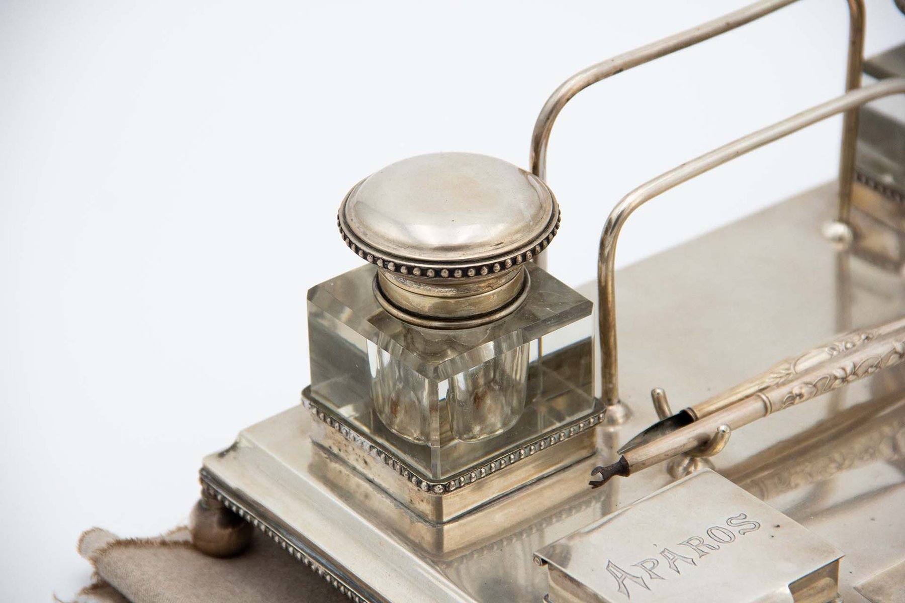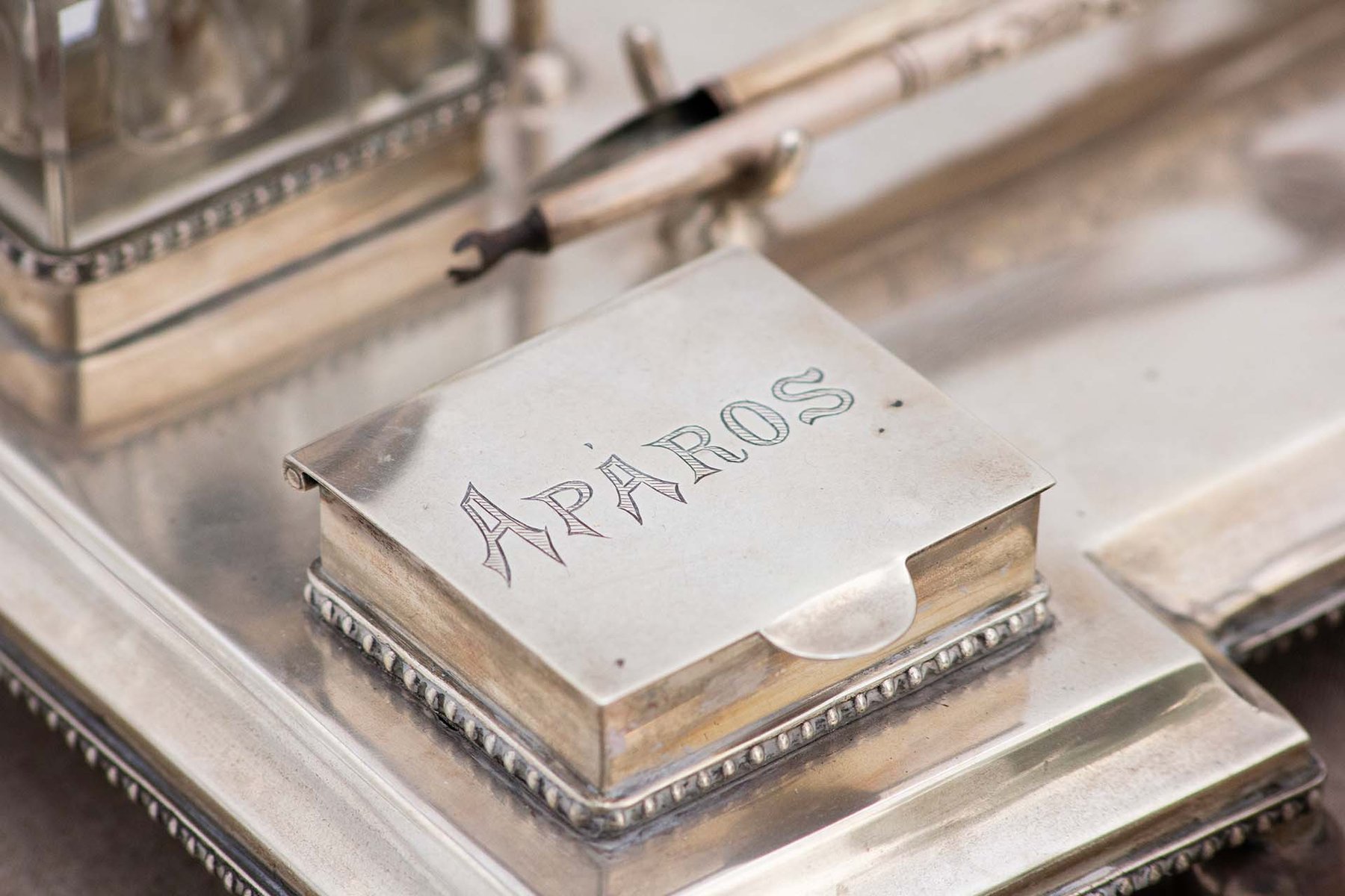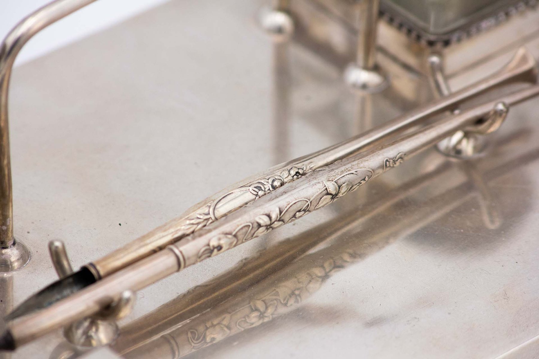Silver Inkwell Embossed with Acanthus Leaves, Glass Tanks and Monogram Card, Set of 4