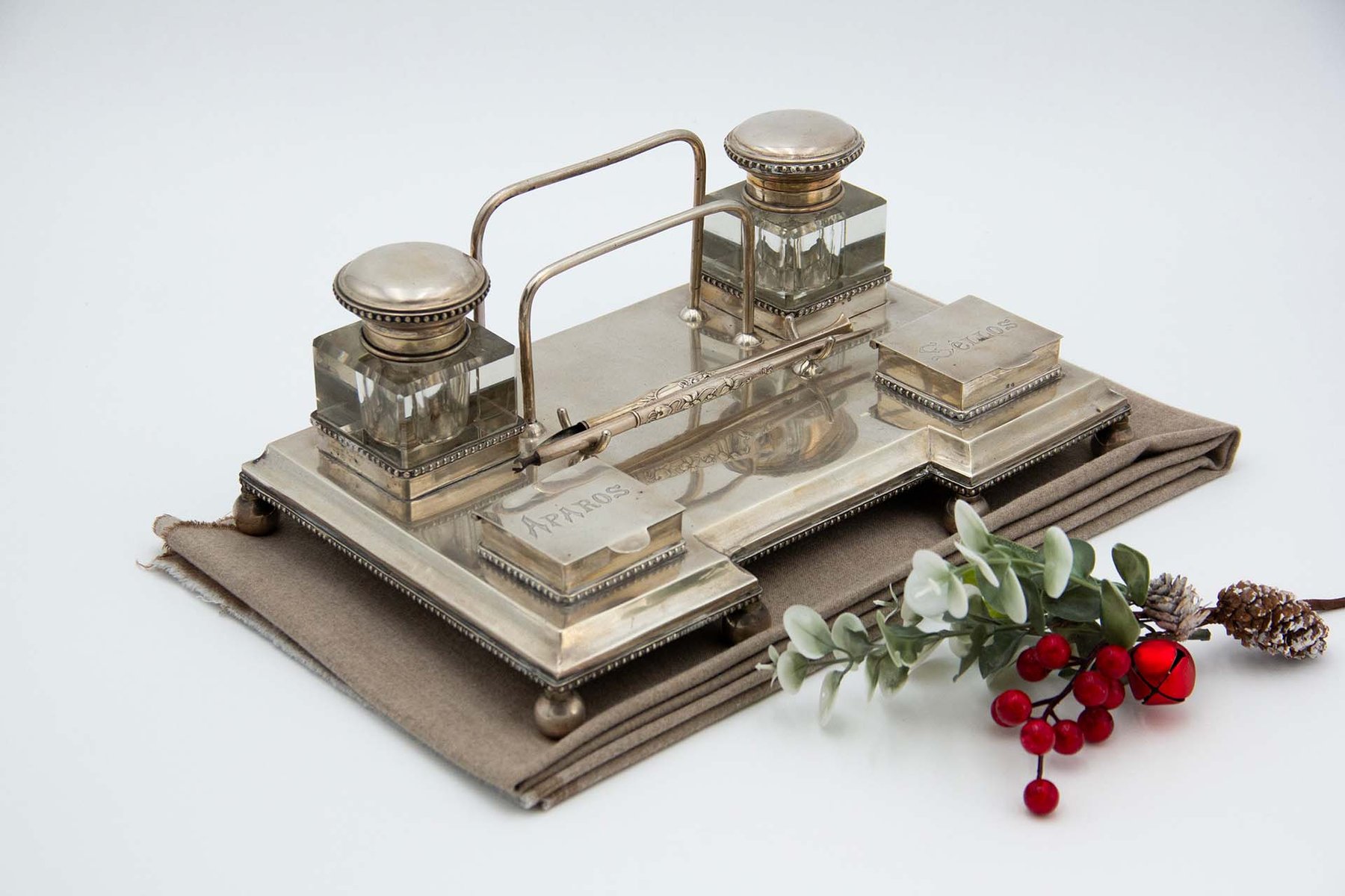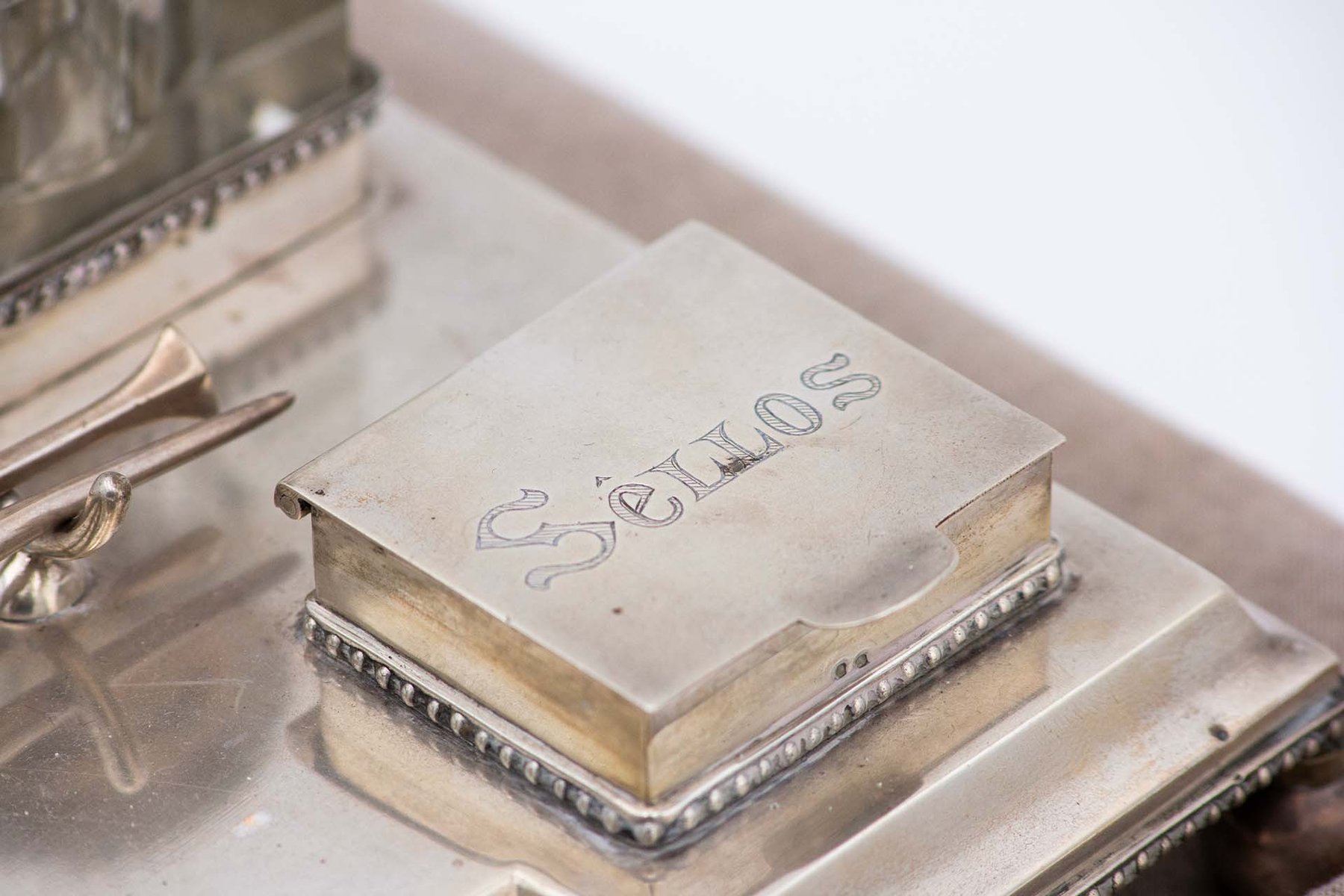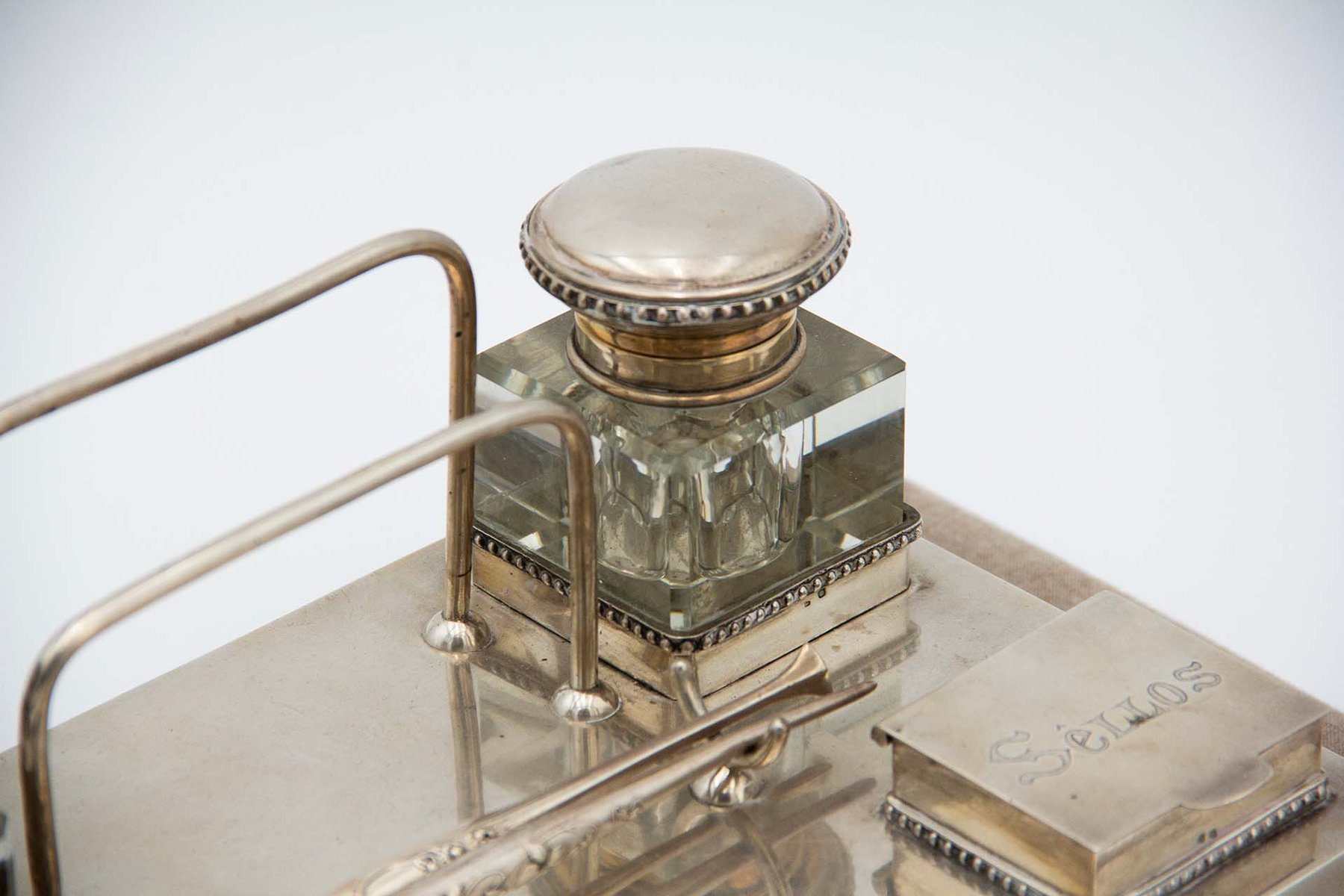 Silver Inkwell Embossed with Acanthus Leaves, Glass Tanks and Monogram Card, Set of 4