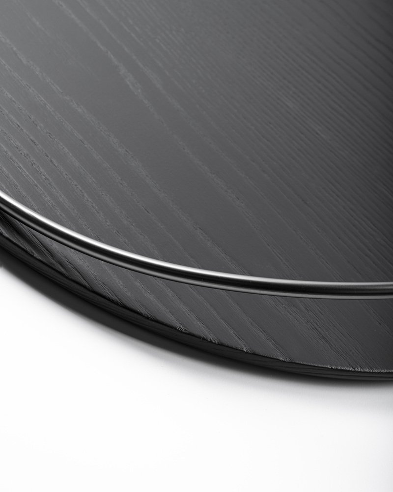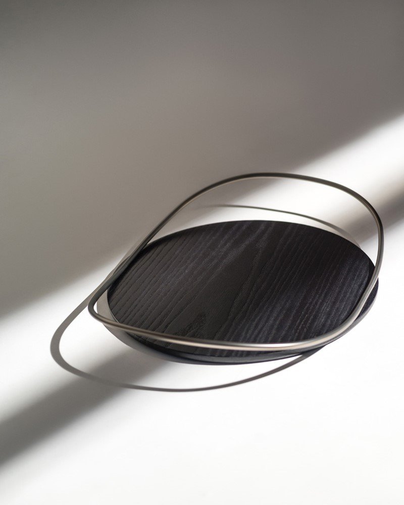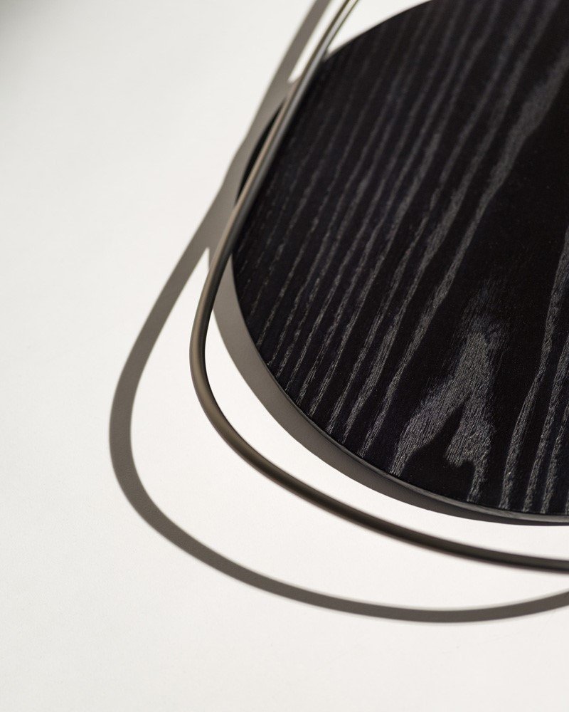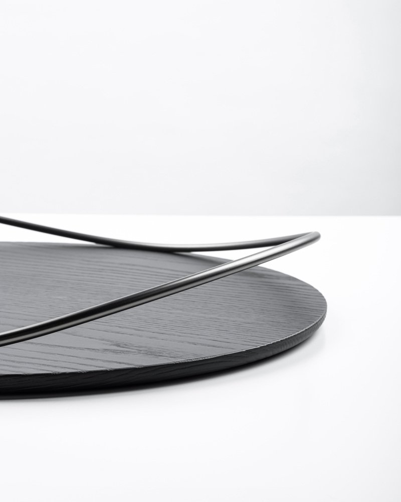 The studio’s series of Touché trays, designed by Bartoli, combine an organically-shaped wooden base–round or oval–with a light metal tube applied to its circumference. This rests obediently along its surface before lifting up, generating handles in a deft, symmetrically undulating motion. Featuring bases of different colors, the series, when positioned next to each other, resembles the varied tablets of a paint box, bright with possibility. In keeping with this artistic inclination is the series of Mia vases, designed by Confalonieri. The soft lines of a round, terracotta or metal base (produced in an array of colors), are contrasted with enclosing grids of perforated sheet metal, generating an elegant, architectural contrast, reminiscent of the decorative effects of the Viennese Secession. A similarly artistic approach to product design is evident in the Fugit series of vases by Fiorini. Constructed from a metal sheet, it seems to fold in on itself, generating a series of angular enclosures, elevations, and apertures and resembles the rigid, straight-edged structure of a building, rather than a vessel. This playful, sculptural approach to function is evident in the more elaborate pieces produced by Mason Editions. Confalonieri’s Lotus table lamp–perched on a conical base of aluminum or brass–presents an abstracted, geometrically simplified depiction of the flower. Its blossoms are constructed from three different elements in blown glass, leading to an intimate, delicate atmosphere when operational. Fiorini’s Alby table, meanwhile, fuses the simple form of a three-legged side-table with a small, spherical lamp of etched white blown glass. In a playful maneuver, the light source seems to have such a weight as to deform the table’s surface-plane on which it rests, in a downward dip. Named in tribute to Albert Einstein, the piece is inspired by the physicist’s space-time studies, his famous Theory of Relativity, and by observations surrounding the movements of a photon.