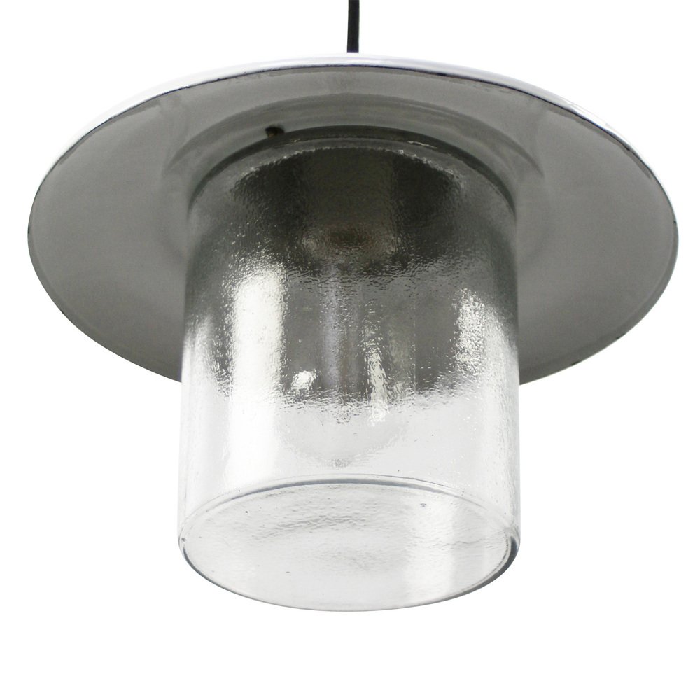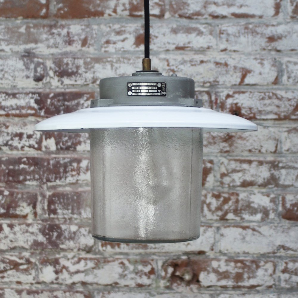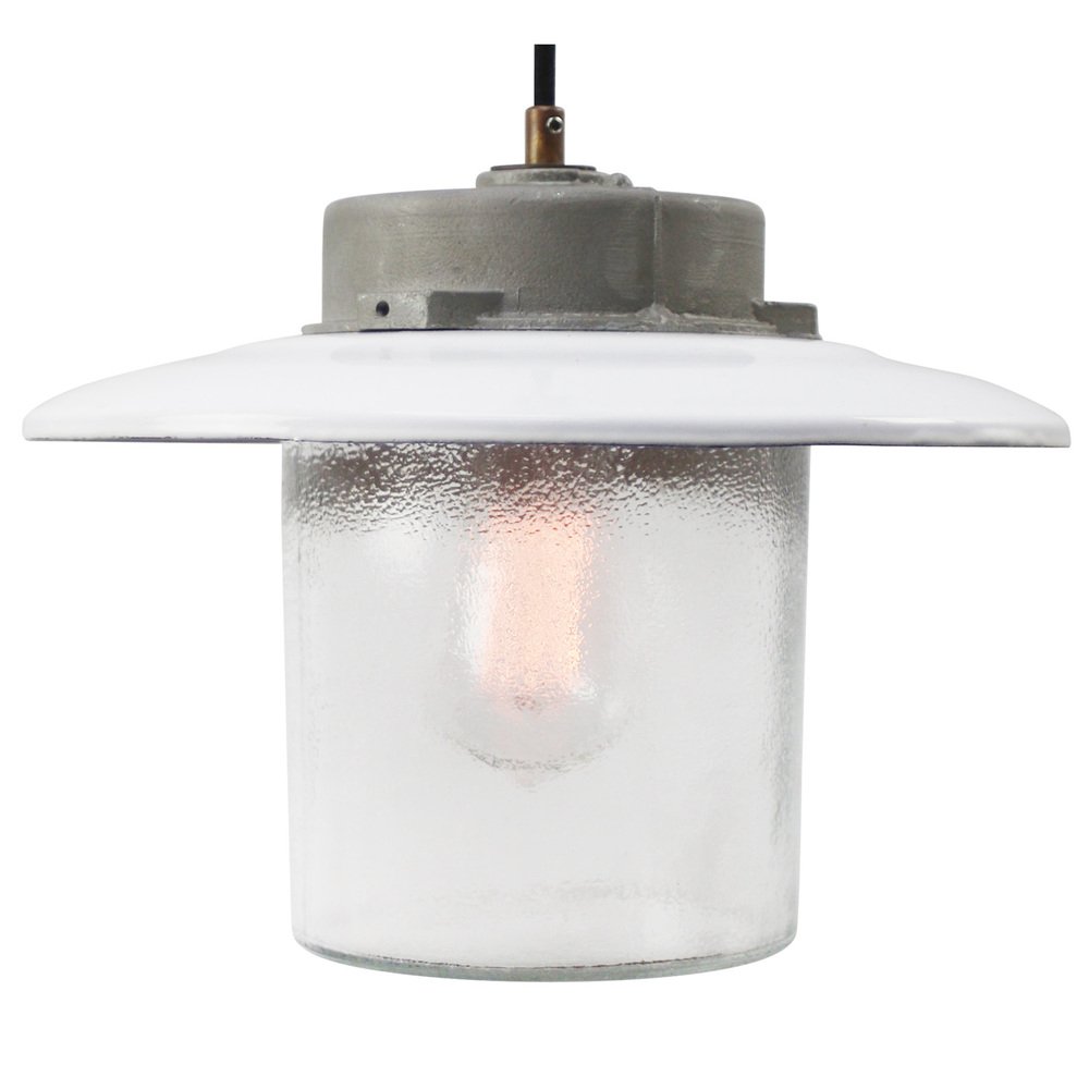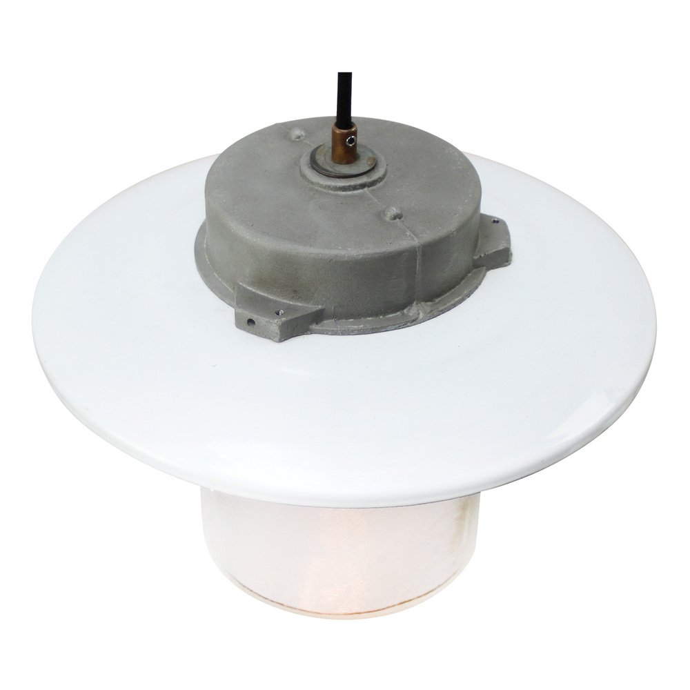 Vintage White Enamel and Frosted Glass Pendant Lamp